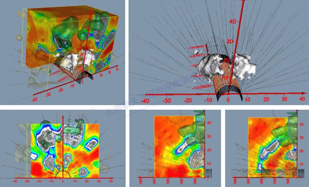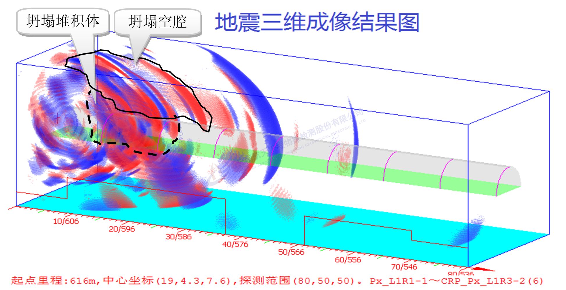 2017年9月,某在建高速公路隧道塌方,我公司利用綜合三維超前預報技術探明了洞內(nèi)坍塌堆積體范圍、洞頂坍腔空間三維形態(tài),為救災、處治提供了重要依據(jù)。