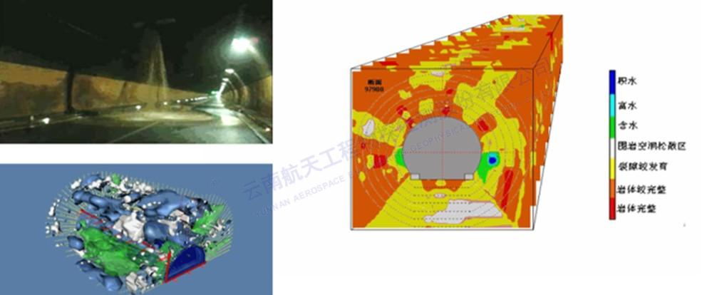 2014年,某高速公路運營隧道發(fā)生滲漏水病害,我公司使用三維高密度電法技術、地質(zhì)雷達三維探測技術查明了隧道所處區(qū)域地下水分布情況、隧道周邊水體三維分布情況,為病害處治提供了技術支撐。